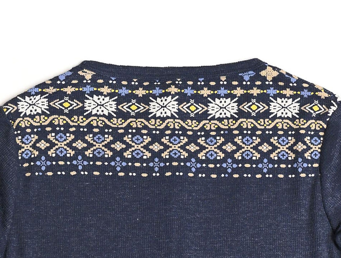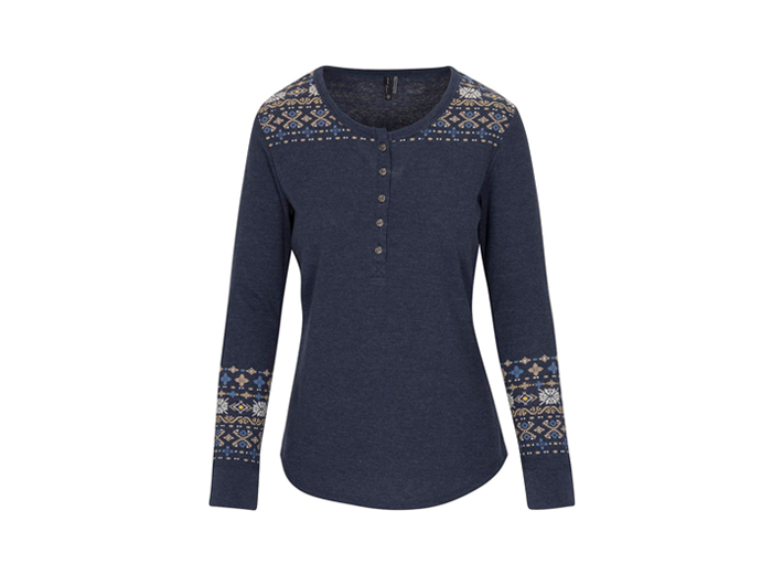 This soft button henley has a festive winter geometric print featured on the shoulders and cuffs. Perfect for your aprés ski fireside snuggles.