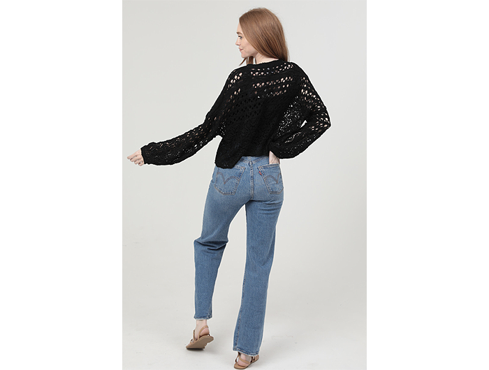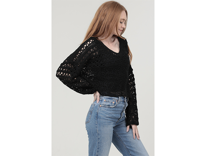Who doesn't love a good layering sweater? This pullover crochet sweater has a delicate open knit with an extended shoulder and cropped front.