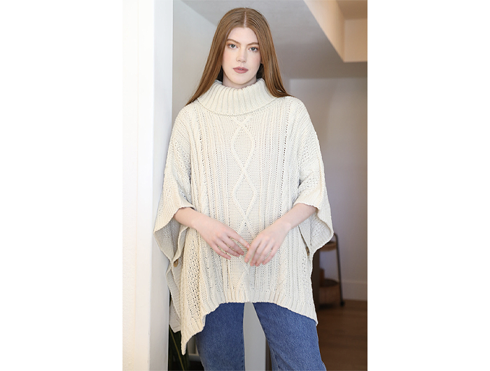This cozy cable knit sweater poncho is perfect for when you need just one more layer to stay warm. A fold-over turtle neck and square cut make this flattering on all bodies.