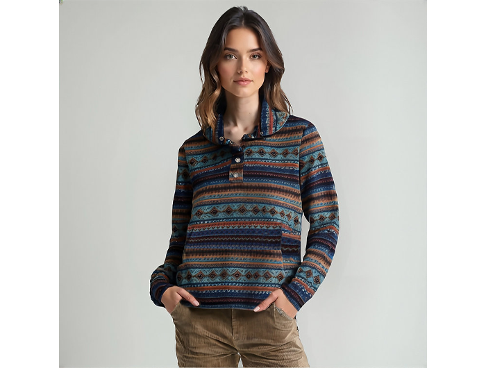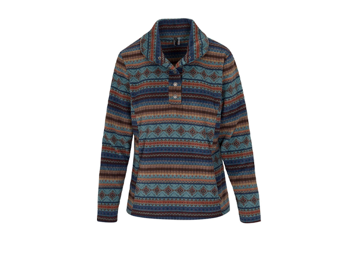 A geometric patterned fleece pullover with a snap button shawl collar. The marsupial front pocket zips on each side to keep your valuables safe.