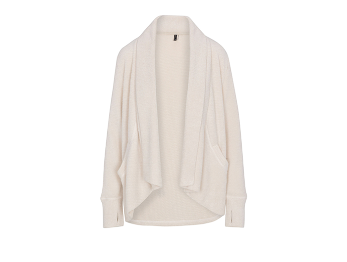 The Hawthorne cardigan is athleisure at its finest. A cozy waffle knit fabric forms a drape front cardigan with pockets and thumb hole cuffs.